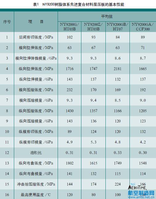 為提高和穩(wěn)定先進復(fù)合材料的成型質(zhì)量,降低先進復(fù)合材料的制造成本,我們根據(jù)不同的復(fù)合材料結(jié)構(gòu)件研制開發(fā)了中高溫度固化、韌性不同的NY9200環(huán)氧樹脂體系,原材料均為國產(chǎn),價廉易購;其配制工藝簡單,質(zhì)量穩(wěn)定,可用于濕法或干法預(yù)浸,無污染,易工程化;其預(yù)浸料具有貯存期長,固化溫度帶寬,固化時間短等優(yōu)點;其先進復(fù)合材料具有韌性和機械性能兼優(yōu)的特性,完全可滿足使用溫度為80~130℃的國內(nèi)先進復(fù)合材料對樹脂基體的要求。其先進復(fù)合材料層壓板的基本性能如表1所示。