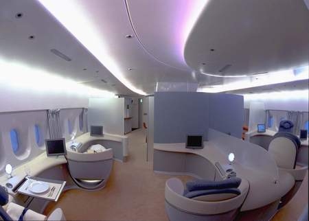 空中客車A380的機(jī)艙配備了為客機(jī)研發(fā)的最先進(jìn)的機(jī)上娛樂(lè)系統(tǒng),光纖配電網(wǎng)絡(luò)使電影、視頻游戲和電視節(jié)目的選擇更加靈活完備。在飛機(jī)上乘客還 可以使用便攜式計(jì)算機(jī)和打電話。有更多的開放空間,比如商務(wù)中心。底艙可選擇為設(shè)置休息區(qū)、商務(wù)區(qū)、酒吧或其它的娛樂(lè)區(qū),按照不同航空公司的需求,還可安 排其它設(shè)施,如理發(fā)店、臥鋪、賭場(chǎng)、按摩室或兒童游戲場(chǎng)。寬大的空間可供頭等艙內(nèi)安排私人套間,甚至包括淋浴設(shè)施的浴室。 123456