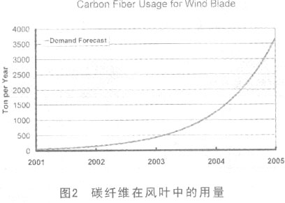 華盛頓的Kirkland公司收到美國能源部(U.S.Department ofEnergy )的75萬美元,作為研發(fā)資金,和TPI Composites公司合作,發(fā)展碳纖維風(fēng)機(jī)葉片,以求得最大的能量獲得,同時減輕風(fēng)機(jī)的負(fù)載。方案通過對30-35m長葉片的設(shè)計,制造和測試以證明先進(jìn)的碳纖維混編設(shè)計的商業(yè)可能性。碳纖維在風(fēng)葉中的應(yīng)用逐年在增加(圖2)