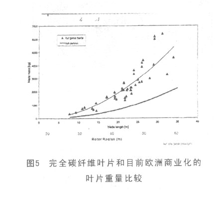 當(dāng)葉片長度增加時,重量的增加要快于能量的提取,因為重量的增加和風(fēng)葉長度的立方成正比(圖1),而風(fēng)機(jī)產(chǎn)生的電能和風(fēng)葉長度的平方成正比。同時隨著葉片長度的增加,對增強(qiáng)材料的強(qiáng)度和剛度等性能提出了新的要求,玻璃纖維在大型復(fù)合材料葉片制造中逐漸顯現(xiàn)出性能方面的不足。為了保證在極端風(fēng)載下葉尖不碰塔架,葉片必須具有足夠的剛度。減輕葉片的重量,又要滿足強(qiáng)度與剛度要求,有效的辦法是采用碳纖維增強(qiáng)。國外專家認(rèn)為,由于現(xiàn)有材料性不能很好滿足大功率風(fēng)力發(fā)電裝置的需求,玻璃纖維復(fù)合材料性能已經(jīng)趨于極限,因此,在發(fā)展更大功率風(fēng)力發(fā)電裝置和更長轉(zhuǎn)于葉片時,采用懺能更好的碳纖維復(fù)合材料是勢在必行。根據(jù)國外有關(guān)資料報道,當(dāng)風(fēng)力機(jī)超過3MW、葉片長度超過40米時,在葉片制造時采用碳纖維已成為必要的選擇。事實上,當(dāng)葉片超過一定尺寸后,碳纖維葉片反而比玻纖葉片便宜,因為材料用量、勞動力、運輸和安裝成本等都下降了。