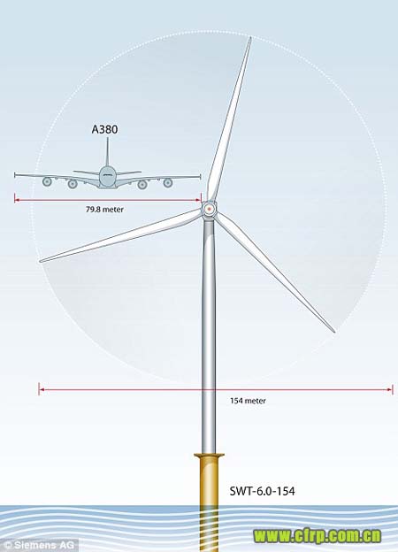 報道稱,這座目前世界上最大的風(fēng)車是由德國西門子公司開發(fā)的大型風(fēng)力發(fā)電機,擁有三片長度達到75米的扇葉,僅僅比空客公司的巨無霸客機A380的翼展(79.8米)略短。報道稱,這座大風(fēng)車將于2014年矗立在臨近英國埃塞克斯郡海岸的水中。