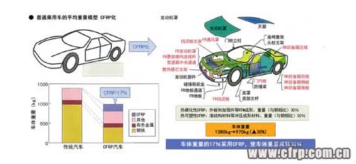 例如,按照碳纖維協(xié)會的推算,普通乘用車的平均車體重量為1380kg,如果盡可能采用CFRP部件,重量大約可以減輕30%,達到97Okg。CFRP的使用量占車體重量的17%左右,約為165kg,這樣一來,如果10年的行駛距離為9.4萬km,二氧化碳排放量可以減少5噸。