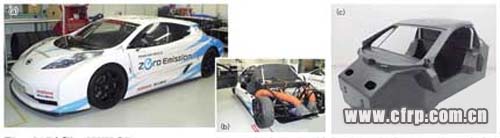 在賽車及跑車中使用最多的是將預(yù)浸料層疊并利用熱壓使其固化的熱塑性CFRP。比如,日產(chǎn)汽車的“LEAF”(中國名:聆風(fēng))的馬達、再比如將減速機中置的EV賽車“LEAF NISMO RC”演示款都使用預(yù)浸料制造了從駕駛室到通風(fēng)罩的絕大部分部件(圖1)。