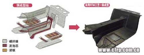 最初的設(shè)計將地板分為6個部件,后來采用RTM工藝統(tǒng)合成了一個部件。不僅減少了模具,還將工時縮短了80%,與粘合組裝相關(guān)的機械加工減少了50%。成型時結(jié)合使用了RTM工藝與注入壓縮工藝。