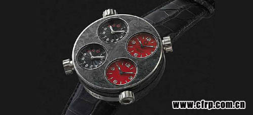 碳纖維手表除了材質(zhì)本身的魅力,在設(shè)計(jì)上也力求創(chuàng)意和精巧,將碳纖維優(yōu)勢(shì)由內(nèi)而外地發(fā)揮出來(lái)。在《Style Carve》雜志推薦的十款性感的男士碳纖維腕表中,位列第一、最受青睞的就是 布雷博(Brembo)的Quattro Valvole CCM。碳纖維的黑色經(jīng)典表面上,張揚(yáng)的兩黑兩紅共四個(gè)小表盤非常醒目。設(shè)計(jì)的靈感來(lái)自于四氣門發(fā)動(dòng)機(jī)的汽缸頭,在四個(gè)氣門的位置各自安裝了獨(dú)立的手表機(jī)芯。該款手表并不是布雷博自己推出的,而是聯(lián)合意大利著名手表廠商麥卡尼克·費(fèi)洛奇(Meccaniche Veloci)共同推出的,亮相于2009 巴塞爾鐘表展上,售價(jià)為15000美元左右。這款表的顏色也做了大膽的嘗試,除黑色外,還有黃色、紅色和銀色。
