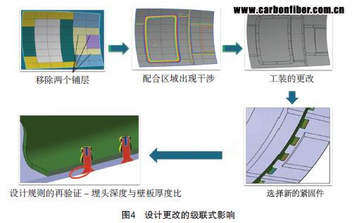 對(duì)于設(shè)計(jì)流程,設(shè)計(jì)更改是無處不在的,并且是一定會(huì)做設(shè)計(jì)更改的。那么設(shè)計(jì)更改的影響是什么呢?考慮機(jī)身壁板中蒙皮厚度變化和基礎(chǔ)結(jié)構(gòu)位置移動(dòng)的連鎖影響。圖4說明的是由于簡(jiǎn)單的鋪層的變化帶來的一系列的設(shè)計(jì)更改。