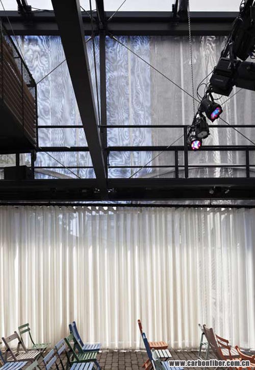 A rigging of lighting, screens, audio equipment and other tools is suspended behind the mesh and can be lowered into the studio for different activities.