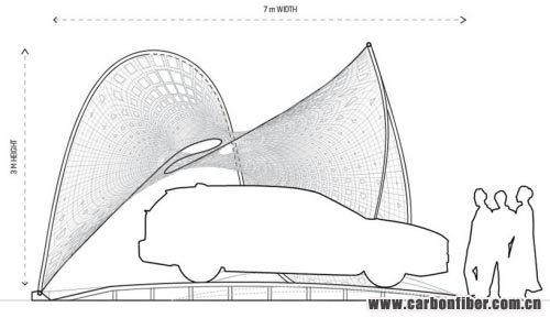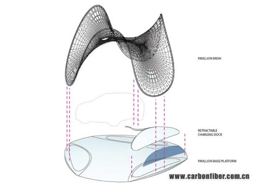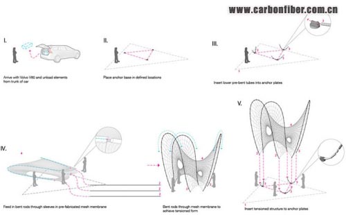 「純張力(PURE Tension)」是由Synthesis Design + Architecture,Buro Happold,和Fabric Images三家公司為沃爾沃的新款混合動力車型V60設(shè)計(jì)的一款充電車篷,組裝簡單,便于攜帶,采用膜網(wǎng)結(jié)構(gòu),可以通過車篷上面的太陽能電池板為汽車充電。