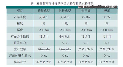 復(fù)合材料連續(xù)成型設(shè)備與傳統(tǒng)成型設(shè)備的比較見表1。連續(xù)成型設(shè)備不受場地和模具的限制,可在小型模具上通過連續(xù)固化成型生產(chǎn)大型、超長復(fù)合材料構(gòu)件。另外,該設(shè)備可通過成型前的自動(dòng)裁剪-鋪疊系統(tǒng),實(shí)現(xiàn)具有鋪層設(shè)計(jì)的復(fù)合材料構(gòu)件的連續(xù)生產(chǎn),這與傳統(tǒng)的拉擠設(shè)備不同,同時(shí)可控制復(fù)合材料構(gòu)件的纖維體積含量。