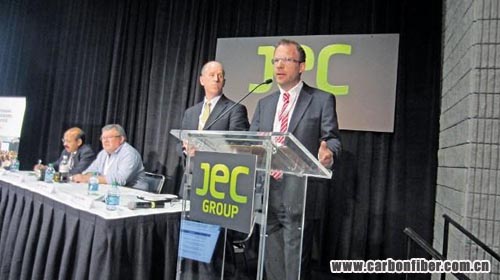 Karl Wagner, Mubea Carbo Tech GmbH CEO, speaks at JEC Americas in Atlanta about his company's composite wheel.Image By: Bill Bregar