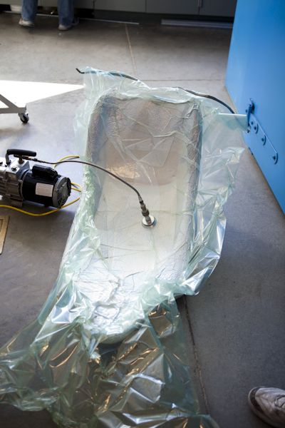 The bag was cut to size by placing the seat inside and allowing extra space for the bag to conform to the seat shape. By sealing off three sides of the vacuum bag and leaving one side open, we decreased the time needed to fully seal the bag later.