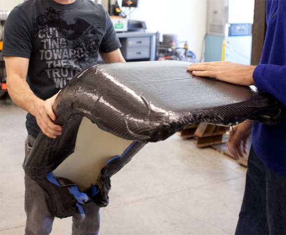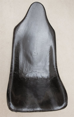 A couple days later, we returned to un-wrap the seat and trim the overhanging edges. Figure 6 shows the part right out of the vacuum bag. The vacuum bag was saved for use with the front layers. Using a box cutter, the extra carbon was easily trimmed off.