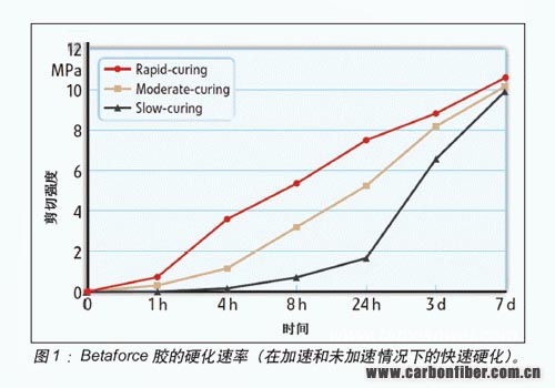 在標準氣候條件下,兩小時后沒有達到該拉伸剪切強度值。但是在加速條件下,1小時候即測得了達3.5MPa。樣本儲存于室溫條件下,強度僅為0.7 MPa。三天后,采用加速膠黏劑,達到了最終強度10.5MPa,而未經加熱反應的樣本,在7天后方達到該強度。