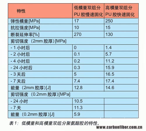 在汽車組裝過程中粘結部件時,雙組分聚氨酯結構膠比較合適。這種膠可以加工成具有不同模量和斷裂伸長率。表1列出了兩種硬化率不同、彈性模量有低有高的雙組分聚氨酯結構膠的性能曲線。