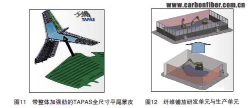 雙曲面、7m 長的扭力盒是作為TAPAS 項(xiàng)目的一部分開發(fā)的,將于2011 年制造并驗(yàn)證完畢。該產(chǎn)品是對灣流G650 平尾中段重新設(shè)計的產(chǎn)物(圖11),其蒙皮的特點(diǎn)是整體對接T 形加強(qiáng)筋。研究還在繼續(xù),以便確定熱壓罐外成型是否可行。纖維鋪放因其在鋪疊過程中對材料的浪費(fèi)最少而成為首選的鋪疊技術(shù)。蒙皮鋪疊將采用專業(yè)化的纖維鋪放設(shè)備單元。該設(shè)備單元將安裝GTech的Vericut 復(fù)合材料程序模塊,以便將CATIA 設(shè)計與機(jī)械手軟件鏈接起來。該設(shè)備單元只需少量投資即可開發(fā),滿足成批量生產(chǎn)12m 全尺寸蒙皮壁板的需求(圖12)。