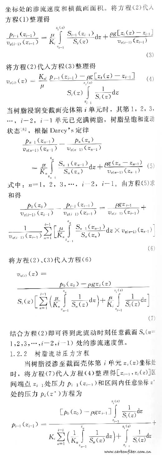 RTM充模的實(shí)質(zhì)是液體樹脂飽和充滿纖維預(yù)制件孔隙并排除其內(nèi)部所含空氣的過程。考慮到三維整體編織變截面薄壁殼體的厚度與其直徑和高度相比,數(shù)量級較小,且薄壁殼體KTM模具樹脂流道的設(shè)計一般采用環(huán)線注射結(jié)構(gòu)方式,因此樹脂充模過程中的流動規(guī)律可近似為多孔介質(zhì)中的一維滲流,即在柱面坐標(biāo)系統(tǒng)(廠,夕,z)中,壓力和速度值僅沿z方向變化。分段一集合計算方法是根據(jù)制件截面形狀方程的種類數(shù),沿軸線將殼體分成若干單元.利用Darcy分鐘定律依次計算出各單元段內(nèi)樹脂流體的運(yùn)功狀態(tài)參數(shù),經(jīng)過數(shù)學(xué)變換,求得變截面薄壁殼體內(nèi)不同位置的樹脂流動速度場、壓力場、位移場和充模時間的分布規(guī)律。為簡化薄壁殼體樹脂流動的理論分析與計算,作如日限設(shè):充模過程中三維編織頂制件不會發(fā)生纖維移動和變形;充模過程中不考慮由于化學(xué)反應(yīng)所引起的粘度變化,樹脂的粘度值為一定值;充模過程中僅考慮宏觀樹脂流動現(xiàn)象.慣性和毛細(xì)作用忽略不計;樹脂注人壓力為Po(zo)。行流動前沿處壓力為0. 本文來自123
