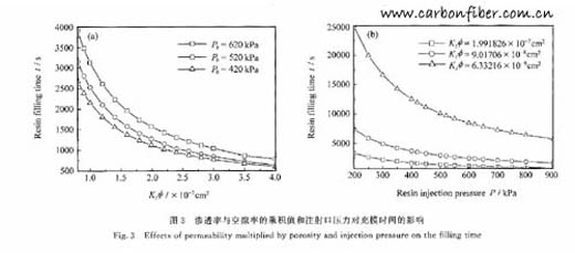 利用復(fù)化辛卜生數(shù)值積分算法和Fortran 99算法語言,對所推導(dǎo)的理論方程(8)、(9)和(11)進(jìn)行編程和數(shù)值計算。由方程(11)可知,在樹脂粘度保持恒定及樹脂流動前沿位置固定的R丁M充模工藝條件下,注射口壓力和三維編織變截面薄壁殼體預(yù)制件滲透率與空隙率(婦的乘積值確定了樹脂充模溢流時間的大小。圖3(a)表示在不同注射口壓力條件下滲透率與空隙率的乘積值對樹脂充模溢流時間的影響。圖3(b)表示在不同的滲透率與空隙率的乘積值條件下注射口壓力大小對樹脂充模溢流時問變化規(guī)律的影響。圖4表示在注射r1壓力分別為420 kPa和620 kPa的恒壓條件下,三個固定位置上(z=100 mm,z2=160 min、=260 mm)壓力理論值p(z1)p(z2)和p(z3)與樹脂流動前沿位置對應(yīng)關(guān)系曲線。山圖4可知,樹脂飽和浸潤區(qū)」或內(nèi)固定點(diǎn)壓力隨樹脂流動前沿位置遞增而增大。