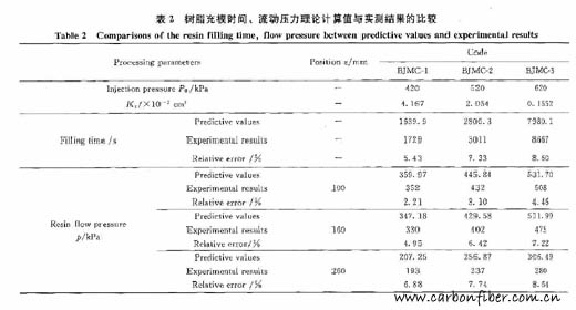 值取決于樹脂流動前沿位置和注射日壓力的大小。為了驗(yàn)證所提出的三維編織變截面薄壁殼體RTM工藝樹脂充模流動分段一集合理論計算方法的正確性,對表1所示的三種規(guī)格的三維編織變截面薄壁殼體進(jìn)行了RTM充模試驗(yàn)。試驗(yàn)選用TDE-85/DDS/BF,乙胺環(huán)氧樹脂體系,以100:15:1.5的質(zhì)最比例混配成所需的膠液,在35分鐘C經(jīng)測試,樹脂粘度為428.6 mPa·s(樹脂粘度測試標(biāo)準(zhǔn)為GB7193-1),固化后其澆注體密度為1. 302 g/crn分鐘(密度測試標(biāo)準(zhǔn)為GB 1033-70)。為準(zhǔn)確測量樹脂充模溢流時間,本試驗(yàn)中采用透明有機(jī)玻璃材料加工RTM模具出料口端蓋,并且在模具內(nèi)部相應(yīng)的位置點(diǎn)上安裝壓力傳感器以測量樹脂溢流后固定位置上的樹脂流動壓力。樹脂充模溢流時間理論計算值與實(shí)測結(jié)果的比較、三個固定位置上樹脂流動壓力理論計算值與實(shí)測結(jié)果的對比如表2所示。由表2所列樹脂充模溢流時間理論計算值與實(shí)測值的比較值可知:當(dāng)K矛值較大時,樹脂充模溢流時間理論計算值具有較高的預(yù)測精度場K淤值逐漸減小時,樹脂充模溢流時問逐漸增大,并且理論計算值與實(shí)測值的相對誤差逐漸增大,這主要是由于過長的充模時間引起樹脂粘度增加所致。 123456