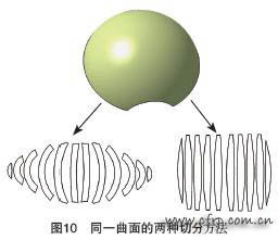 復(fù)合材料結(jié)構(gòu)中承載纖維的關(guān)鍵是要連續(xù)和繃緊。有一種曲面鋪疊方法是將等高線做為基準(zhǔn),其具體做法是用一組平行的平面去切割曲面,將交線做為鋪層的基準(zhǔn)方向并且作為小鋪層的拼接線。這種方法對(duì)于平面是正確的,但是對(duì)于曲面時(shí)就會(huì)出現(xiàn)問題,在鋪疊并排的小鋪層時(shí)會(huì)出現(xiàn)不規(guī)則形狀,在預(yù)浸料的邊緣出現(xiàn)大量的斷纖維,有的地方甚至所有的纖維都是斷的,這種現(xiàn)象會(huì)隨曲率的變化而加劇。顯然,斷了的纖維不能傳遞載荷,只有在垂直于切割平面的附近的纖維是連續(xù)的,這種方法不合理(圖9、圖10)。 本文來自123