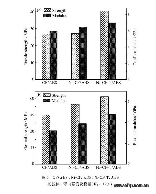 圖5(a)是未鍍鎳碳纖維(CF)以及不使用和使用偶聯(lián)劑處理的鍍鎳碳纖維(Ni-CF)分別與ABS復合制得的復合材料(分別簡寫為CF/ABS、Ni-CF/ABS、Ni-CF-T/ABS)的拉伸強度和拉伸模量(碳纖維質量分數(shù)為12%)。從圖5(a)可以看出,經(jīng)鈦酸酯偶聯(lián)劑處理過的Ni-CF-T/ABS的拉伸強度和拉伸模量均比其他2種復合材料高,分別為41MPa和7GPa。CF/ABS和Ni-CF/ABS的拉伸強度相差不多,為27MPa左右;拉伸模量分別為6GPa和6.5GPa。Ni-CF/ABS的拉伸性能略高于CF/ABS。