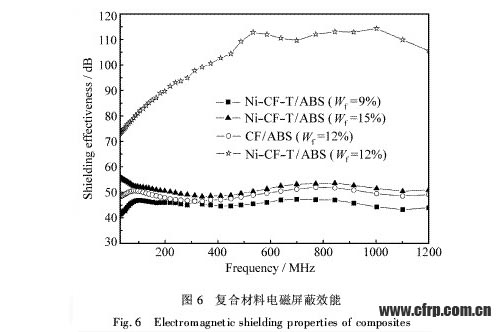 其中:μr為材料相對銅的磁導率;σr為材料相對銅的電導率;f為電磁波的頻率;t為材料厚度。因此,當材料厚度t和入射電磁波頻率f一定時,材料的電磁屏蔽效能主要與σr和μr有關。纖維表面金屬化后,σr和μr值增大,復合材料屏蔽效能增加。圖6是復合材料在30~1200MHz頻率范圍內的電磁屏蔽效能曲線。由圖6可以看出,Wf=12%時,CF/ABS的屏蔽值在50dB左右,而Ni-CF-T/ABS的屏蔽值均在73dB以上,最高可達114dB。在500~1000MHz范圍內,碳纖維鍍鎳對電磁屏蔽性能的增強作用尤為顯著,屏蔽值提高60dB。可見,纖維表面金屬化可明顯提高材料的電磁屏蔽性能。同時,110dB的屏蔽值超過國外同類產品。