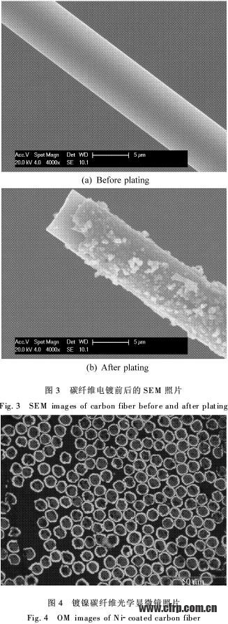 采用SEM對碳纖維電鍍前后的形貌進行觀察;采用光學顯微鏡對材料鍍層厚度進行觀察;彎曲性能參照GB/T9341-2000,采用CSS-44001電子萬能試驗機測試;電磁屏蔽效能參照QJ2809-96,由中國計量科學研究院測定。測試環(huán)境條件:溫度為22.5℃;濕度為45%(RH);測試頻率范圍為30~1200MHz。