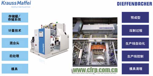 德國加工機械領(lǐng)域的專家迪芬巴赫公司(Dieffenbacher)和克勞斯瑪菲公司(KraussMaffei)在RTM技術(shù)領(lǐng)域展開了合作,他們對以上的市場需求做出了響應(yīng)——開發(fā)了一條高壓樹脂傳遞模塑成型工藝(HP-RTM)的自動化生產(chǎn)線。這條生產(chǎn)系統(tǒng)包括了預(yù)成型加工、壓制過程,以及修整工藝。相比于傳統(tǒng)的RTM工藝,該HP-RTM工藝減少了樹脂注射次數(shù),提高了預(yù)制件的浸漬質(zhì)量,并縮短了成型周期。