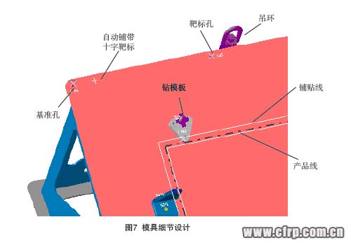 (6) 復(fù)材制件定位孔:也叫制件工藝耳片孔,用于復(fù)材制件在脫模后檢測(cè)、機(jī)加和裝配時(shí)作定位基準(zhǔn),精度要求高。此孔需要有相應(yīng)的鉆模板來準(zhǔn)確定位,鉆孔需要在脫模前進(jìn)行,孔應(yīng)該在模具的法線方向。 本文來自123