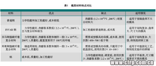 用作復(fù)合材料成型模具的材料主要有普通鋼、INVAR鋼、復(fù)合材料(雙馬和環(huán)氧樹脂)、鋁等。通常根據(jù)材料的性能(主要是高溫下的熱膨脹系數(shù))、成本、周期及使用次數(shù)來選擇,見表1。