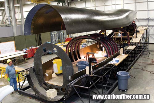 圖3 先進(jìn)復(fù)合材料貨運(yùn)飛機(jī)的機(jī)身由8個(gè)部件組成,它們采用英國(guó)先進(jìn)復(fù)合材料集團(tuán)(ACG)提供的MTM-45預(yù)浸料經(jīng)過OOA固化制成。圖片來源:洛克希德馬丁公司 123456