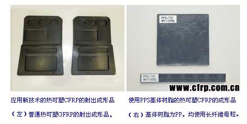 運(yùn)用新技術(shù)制造的熱可塑CFRP,是令長(zhǎng)度7mm左右的碳纖維束含浸樹脂制成的“長(zhǎng)纖維母粒”。用戶把這種母粒投入射出成形機(jī),便可以成形為所需形狀。通過(guò)在樹脂中添加碳纖維,可以獲得強(qiáng)度比樹脂單體更高的成形品(這一階段的纖維平均長(zhǎng)度為0.6~0.7mm左右)。