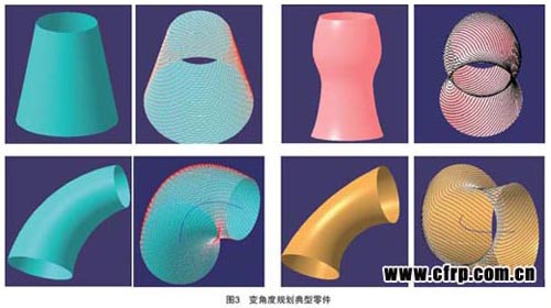 目前,我們提出了一種新的變角度軌跡規(guī)劃算法,可實(shí)現(xiàn)錐殼類零件、外殼類零件及變截面接頭類零件的加工制造,如圖3所示。變角度軌跡規(guī)劃算法在上述零件的具體實(shí)現(xiàn)中,其最大優(yōu)點(diǎn)是避免了除零件端面外的剪切與重送,可簡化纖維鋪放過程,提高加工效率。同時(shí),改變初始鋪放角,還可以改變零件的固有頻率,對(duì)改善整體系統(tǒng)的共振,具有一定的作用。