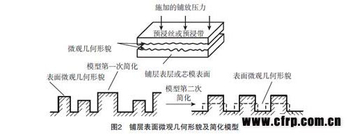 鋪層間緊密接觸度被定義為:在任意給定時(shí)間,兩鋪層接觸面積占鋪層面積總面積的百分比,與溫度、壓力、接觸時(shí)間有關(guān)[17]。由于表面粗糙度的原因,預(yù)浸絲或預(yù)浸帶表面與鋪層表面(或芯模表面)的微觀幾何形貌為不規(guī)則體,在未加熱和未施加壓力的條件下,預(yù)浸絲或預(yù)浸帶表面與鋪層表面(或芯模表面)不可能完全接觸。為理論計(jì)算方便,國外研究人員首先將不規(guī)則的微觀幾何體簡化成大小不同的矩形(指截面),然后再將上述矩形簡化成大小相同的矩形[18-20]。纖維鋪放過程中,在加熱到一定溫度時(shí),當(dāng)壓輥對(duì)預(yù)浸絲或預(yù)浸帶施加一定的鋪放壓力后,預(yù)浸絲或預(yù)浸帶與鋪層表面(或芯模表面)的突起的矩形將發(fā)生變形,矩形高度將減小,寬度將增大,然后根據(jù)這一模型,建立計(jì)算鋪放壓力與鋪層間緊密接觸度之間的函數(shù)關(guān)系。將現(xiàn)行的粗糙度評(píng)價(jià)指標(biāo)融入上述計(jì)算模型中,可顯著提高實(shí)際應(yīng)用的方便程度。圖2為鋪層表面微觀幾何形貌及簡化模型示意圖。