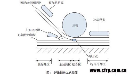 在自動(dòng)纖維鋪放過程中,為提高鋪放效率,通常設(shè)置預(yù)加熱及主加熱2個(gè)加熱環(huán)節(jié)。在這2個(gè)環(huán)節(jié)中,都會(huì)涉及到選擇熱源、建立加熱模型及確定加熱溫度三方面的問題。圖1所示為纖維鋪放工藝簡圖。