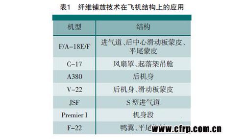 自動(dòng)纖維鋪放技術(shù)是飛機(jī)復(fù)合材料構(gòu)件自動(dòng)化成型的關(guān)鍵制造技術(shù)之一,其又可細(xì)分為自動(dòng)纖維絲鋪放技術(shù)和自動(dòng)纖維帶鋪放技術(shù)。前者適用于平面型或低曲率的曲面型,或者說準(zhǔn)平面型復(fù)合材料構(gòu)件的鋪層制造;后者綜合了自動(dòng)纖維纏繞與自動(dòng)纖維帶鋪放兩者的優(yōu)點(diǎn),可實(shí)現(xiàn)復(fù)雜曲面型復(fù)合材料構(gòu)件的鋪層制造。表1中列出了纖維鋪放技術(shù)在飛機(jī)結(jié)構(gòu)上的應(yīng)用情況[1]。