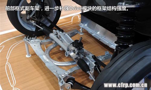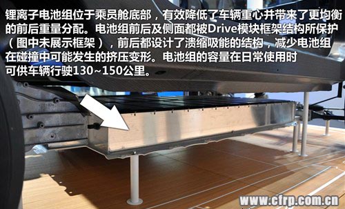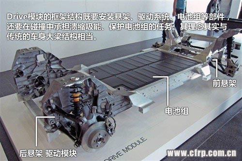 寶馬i系列車型采用了“LifeDrive”模塊架構,它由“Life”和“Drive”兩個獨立的模塊組成,“Life”代表乘員艙部分,采用超輕量化并且高強度的CFRP碳纖維復合材料構成,而“Drive”則將懸架、蓄電池組、驅動系統(tǒng)和碰撞防護結構納入整個模塊中。仔細看就會發(fā)現(xiàn),這種結構的理念其實與傳統(tǒng)的非承載車身相似,不過高強度的復合碳纖維乘員艙是那些傳統(tǒng)非承載車身的車廂所望塵莫及的。