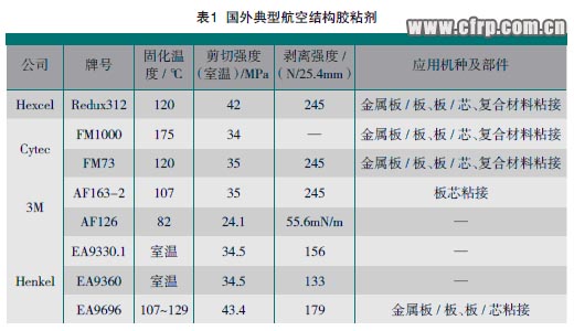 表1、表2分別列出幾種典型國內(nèi)外復合材料膠粘劑及其基本性能。
