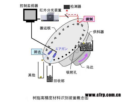 樹脂碎片由設有小孔的圓盤狀搬運板自動搬運。通過使搬運板傾斜,利用樹脂碎片自身的重量使其落入各個小孔,被自動搬運至識別位置。這樣便可連續(xù)識別。另外,該識別設備利用氣槍自動篩選識別后的碎片,使篩選后的樹脂的純度檢查也實現(xiàn)了自動化。