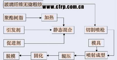 圖4所示為噴射成型工藝(Spray Up Molding)示意圖。該工藝是將混有引發(fā)劑和促進(jìn)劑的兩種聚酯分別從噴槍兩側(cè)噴出,同時(shí)將切斷的玻纖無捻粗紗由噴槍中心噴出,使其與樹脂在空間均勻混合后沉積到模具上。當(dāng)沉積到一定厚度時(shí),用壓輥滾壓使纖維浸透樹脂,排除氣泡,在經(jīng)常溫固化后成型為汽車復(fù)合材料制品。噴射成型工藝是在手糊成型工藝的基礎(chǔ)上發(fā)展起來的。由于該工藝是借助于機(jī)械的手工操作工藝,因此也被稱為“半機(jī)械手糊成型工藝” 。圖5所示為該工藝的工藝流程。