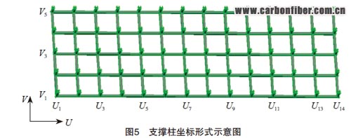 對(duì)復(fù)合材料固化工裝而言,工裝型面的變形將直接影響與其接觸的復(fù)合材料制件的成型質(zhì)量,垂直型面方向的翹曲變形將直接影響到大尺寸復(fù)合材料成型的曲率精度,所以型面變形場的表征方法應(yīng)該與型面的變形直接相關(guān)。為對(duì)成型工裝的型面變形量進(jìn)行表征,所用支撐柱如圖5所示。
