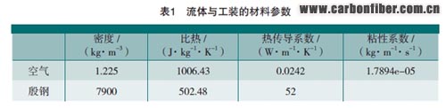由經(jīng)驗(yàn)和工藝試驗(yàn)可知工裝的變形均在毫米量級(jí),工裝的尺寸在幾米至十幾米,工裝結(jié)構(gòu)變形不會(huì)對(duì)熱壓罐內(nèi)的氣體流動(dòng)產(chǎn)生明顯影響。由于流體計(jì)算對(duì)網(wǎng)格要求較高,文中使用專業(yè)流體仿真軟件FLUENT進(jìn)行工裝及熱壓罐內(nèi)整個(gè)流場的網(wǎng)格劃分,如圖3所示。對(duì)工裝建立的有限元模型既可以適用于溫度場的計(jì)算,也可以用于工裝的結(jié)構(gòu)變形計(jì)算。熱壓罐工藝規(guī)范簡化如圖4所示,溫度場計(jì)算所用相關(guān)材料參數(shù)如表1所示。