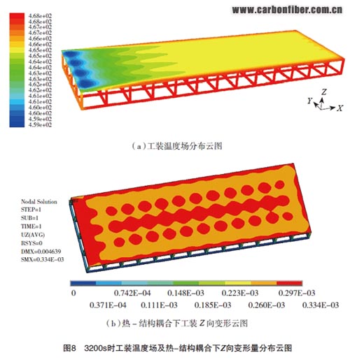 在復(fù)合材料的熱壓罐固化過程中,對(duì)柱支撐形式的固化工裝型面,溫度不均勻性導(dǎo)致的型面翹曲變形較為復(fù)雜。在工裝結(jié)構(gòu)內(nèi)部,支撐柱存在位置所對(duì)應(yīng)型面的局部變形量大于沒有支撐柱存在的位置,這是因?yàn)橹沃鶎?duì)空氣的擾流作用加快了支撐柱與周圍空氣之間的熱傳遞。圖8為3200s時(shí)工裝溫度場及Z向結(jié)構(gòu)變形量分布云圖。