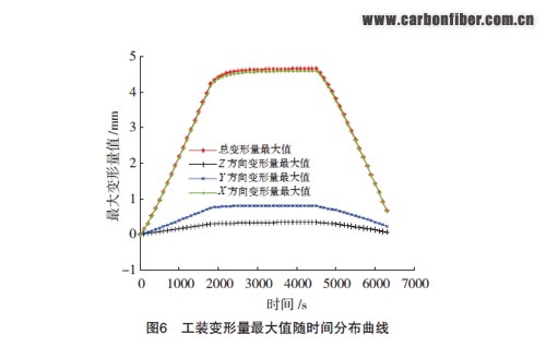 復(fù)合材料在熱壓罐中固化分為3個(gè)熱歷程:升溫、恒溫和降溫,此過程中工裝溫度場分布的不均勻性導(dǎo)致各部分熱應(yīng)力分布不均勻,工裝在熱應(yīng)力和自重載荷耦合作用下產(chǎn)生變形。熱歷程中工裝變形量最大值分布如圖6所示,從圖中可得出: