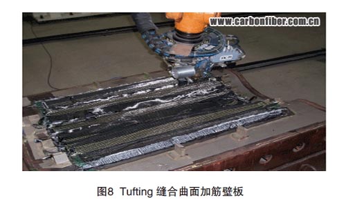 縫合時(shí)縫線幾乎處于自由狀態(tài),張力很小,僅靠縫線與預(yù)制體的靜摩擦力把縫線留在預(yù)制體內(nèi)部。因此,為了能保證縫線能順利留在預(yù)制體內(nèi)部,會(huì)在預(yù)制體鋪疊時(shí)加入少量定位膠黏劑來增大預(yù)制體與縫線的摩擦,從而保證縫合的順利進(jìn)行。在縫合泡沫夾芯預(yù)制體時(shí),定位膠黏劑作用不明顯,可以在預(yù)制體底部加襯一層薄橡膠,以達(dá)到留住縫線的效果,縫合完成后再取下橡膠。對(duì)于相對(duì)較薄的預(yù)制體也可以采用此種方法來提高Tufting縫合質(zhì)量。圖8是采用Tufting技術(shù) 縫合曲面加筋壁板。
