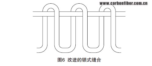 (1)鎖式縫合(改進(jìn)鎖式縫合)。因其工藝性較好在復(fù)合材料預(yù)制體研制中得到廣泛使用。傳統(tǒng)鎖式縫合方式較常見,其特點(diǎn)是縫線和底線的結(jié)點(diǎn)在制件厚度的中間位置,這對(duì)于復(fù)合材料來說,結(jié)點(diǎn)處的應(yīng)力集中很大程度上會(huì)影響復(fù)合材料性能的提高。因此,在傳統(tǒng)鎖式縫合的基礎(chǔ)上進(jìn)行工藝優(yōu)化,出現(xiàn)了改進(jìn)鎖式縫合,圖6即為改進(jìn)的鎖式縫合。在復(fù)合材料縫合中,改進(jìn)鎖式縫合應(yīng)用較多,使用此縫合方式制件在厚度方向縫合線彎曲少,對(duì)面內(nèi)纖維的損傷少,由縫合引起的應(yīng)力集中也較小,因此使復(fù)合材料具有相對(duì)更高的損傷容限。 內(nèi)容來自123456