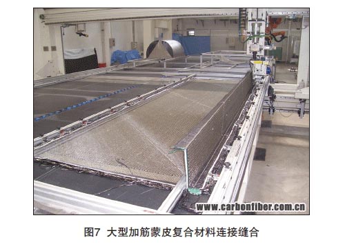 鎖式縫合因其受雙面縫合的工作原理所限,對(duì)預(yù)成型體的縫合工作只能在縫合設(shè)備工作平臺(tái)上完成,所以通常此種縫合方式只適用于曲率相對(duì)較小的預(yù)制體上,縫合厚度可達(dá)20mm。鎖式縫合對(duì)縫線的張力可做相應(yīng)調(diào)節(jié),因此在沒有特殊定位要求的情況采用鎖式縫合無需對(duì)預(yù)制體使用定位膠粘劑。通過調(diào)節(jié)鎖縫,復(fù)合材料加強(qiáng)筋與蒙皮連接的結(jié)構(gòu)應(yīng)用鎖式縫合較多,在靠近立筋的縫合區(qū)需要更換小壓腳來保證縫針靠近加強(qiáng)筋根部從而完成縫合。圖7為應(yīng)用鎖式縫合對(duì)復(fù)合材料大型加筋蒙皮的連接縫合。