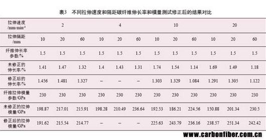 最后可以根據(jù)線性回歸后的分析結(jié)果,對測試讀出的數(shù)據(jù)進(jìn)行修正。將系統(tǒng)受力產(chǎn)生的伸長量剔除,得到碳纖維真正的伸長率和模量等力學(xué)指標(biāo),見表3。