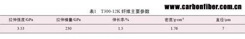 試驗采用市售商品日本東麗公司聚丙烯腈( PAN) 基碳纖維,牌號 T300B-12K,簡稱 T300,它是國際公認(rèn)的通用級標(biāo)準(zhǔn)碳纖維,性能參數(shù)見表1。