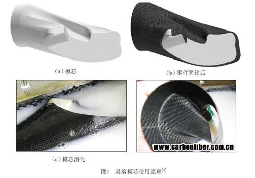 易溶模具是指采用在某種溶劑中易于溶解的材料運用澆鑄法或模壓法制成空心或實心的模具。復合材料構件依賴這種模具成型后,從開口處通入合適溫度的溶劑,使模具材料溶解進而從構件中流出。低溶鹽和石膏是常用的芯模材料。另外,水溶性型芯材料也可由粘結劑和陶瓷填料組成,粘結劑為有機高分子材料,具有脫水固化、遇水溶解的可逆特性;陶瓷填料由氧化鋁和高嶺土組成,陶瓷料漿的固相體積分數(shù)使粘結劑具有良好的水溶性和高的熱分解溫度[7]。圖7為易容模芯的使用原理。