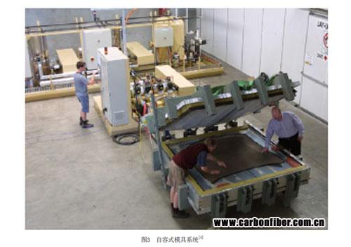 自容式模具(圖3)系統(tǒng),加熱和加壓是模具的一部分,熱源可以是電、熱油或蒸汽,能夠解決一些熱壓罐的不足之處,可以用來生產(chǎn)大于現(xiàn)有設備的零部件,且具有成本低、升壓速度快、溫度控制精確的優(yōu)點。